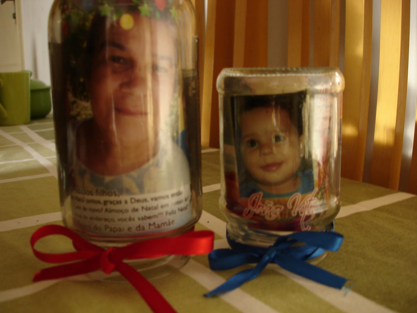Como a onda agora é reaproveitar, então que tal usar aquele vidrinho de milho, azeitona, palmito, papinha... É só lavar bem e passar álcool, depois coloque a sua foto dentro e dê um toque especial usando a sua criatividade...